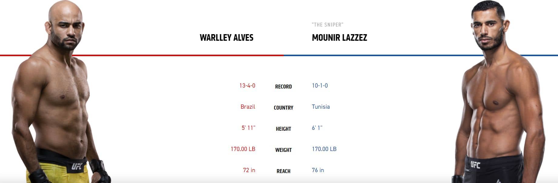 Tunisan Lazzez je komplexní a kvalitní bojovník. Brazilce Alvese poslední dobou hodně trápí chabé kardio. Jestli nedokáže ukončit Lazzeze během prvního kola, tak to s ním bude vypadat hodně bledě. Lazzez ovšem ukázal, že je velmi odolný a jeho poslední výkon potvrdil, že tenhle bojovník míří hodně vysoko. Kurzy opět nejsou nic moc, takže Lazzezovu výhru v kurzu 1,42 přikládám k výhře Simóna za 1,24 což nám dělá celkový kurz 1,76.