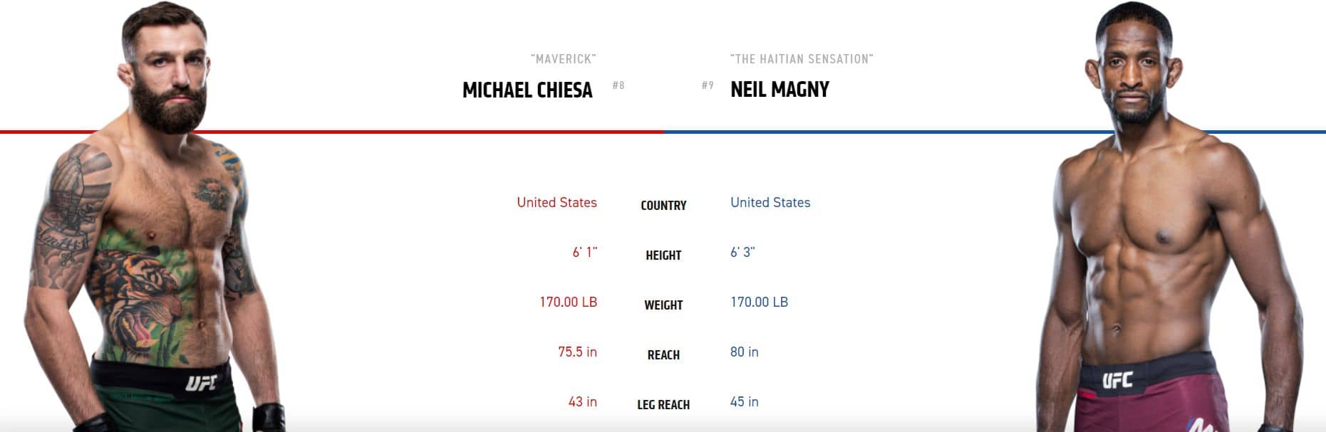 Velmi těžký zápas na sázení. Čekám, že tenhle zápas se rozhodne v graplingu. Chiesa je pro mě v tomto ohledu lepší bojovník. Problém je, že jedeme na 5 kol a Chiesovo kardio je takové všelijaké. Poslední dobou se ovšem zdá, že na kardiu hodně zapracoval a už je na tom evidentně lépe, i když Magnyho kardio bude pořád lepší. Magny je ten typ bojovníka, který moc soubojů neukončí před limitem a vyhrává hlavně na body. Chiesa vyhrává hlavně na submise a jen třetinu výher má na body. Magny posledních 5 let vůbec nebojoval proti kvalitním graplerům a to přináší jenom další otázky. Kdyby se bojovalo na tři kola, tak dám Chiesu, ale jedeme na pět, takže nemůžu. Na hlavní zápas se těším, ale po dlouhé době ho nevsadím.