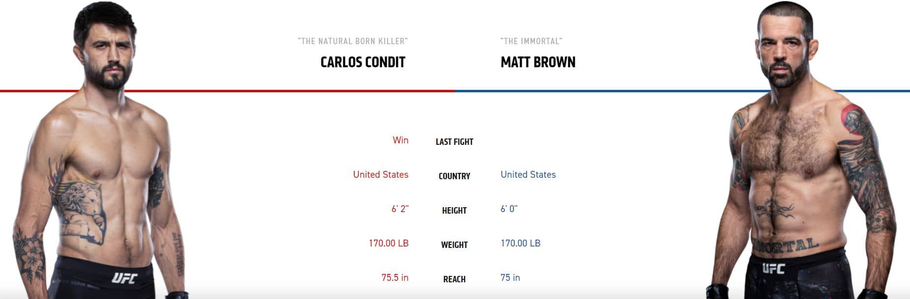Hlavní předzápas nám nabídne souboj dvou legend. Carlos Condit vs Matt Brown by byl ještě tak před pěti lety neskutečným tahákem, ale čas nezastavíš a oba bojovníci už jsou za svým zenitem. Nicméně zatímco Brown už intenzivně mluvil o konci kariéry v roce 2018, tak z Condita je po poslední výhře zase cítit ten oheň jako za mlada. Oba dva mají přes 90% výher na ukončení což je něco neskutečného a jsem si docela jistý, že ani tento zápas nedojde na body. Čtyřicetiletý veterán Brown už je dost neaktivní a z šesti posledních zápasů hned 4× prohrál a vždy to bylo před limitem (3 KO a 1 submise). Brown už není schopen inkasovat a at’ už údery na hlavu nebo na trup ho můžou vyřadit velmi snadno. Condit sice už taky není tam kde býval, ale pořád je velmi nebezpečný a schopný rozdávat tvrdé údery. Měl krizi kde prohrál pět zápasů v řadě, byt’ proti světové špičce se kterou už Brown nějaký ten rok nezápasil, ale zase se dokázal vrátit na vítěznou vlnu a jeho poslední představení bylo velmi působivé. Condit je taky na rozdíl od Browna celou svoji kariéru neskutečně odolný, a když nepočítám jedno smolné zranění, tak prohrával jen na submise, které mu od Browna moc hrozit nebudou. V zápase sázím, že nebude ukončen na body v kurzu 1,76. Odvážní sázkaři mohou zkusit Condita na KO v kurzu 3,20 kde taky vidím hodnotu, ale Brown už 10× prohrál na submisi a sám Condit má už úctyhodných 13 submisí, tak pozor!