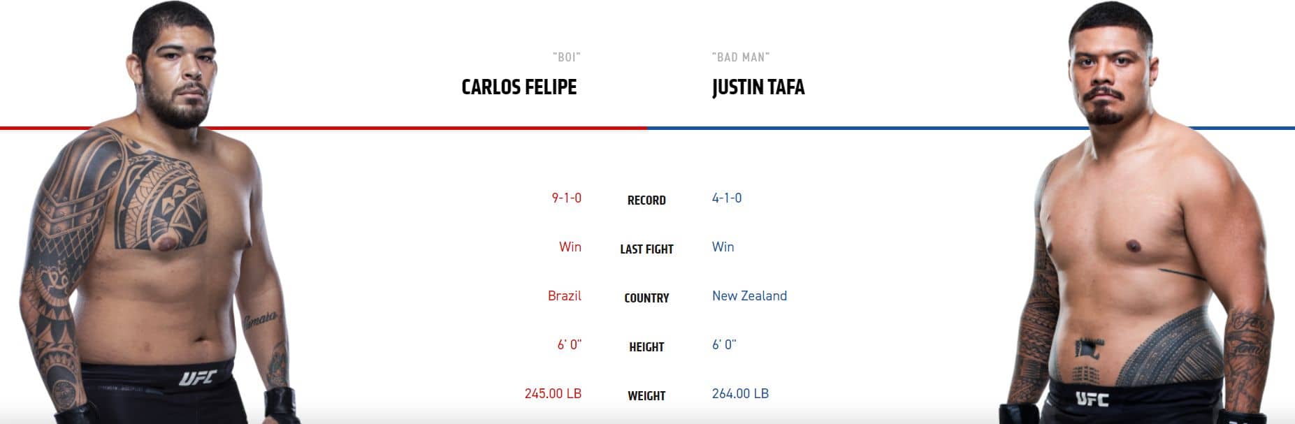 Zápas těžkých vah: Justin Tafa vs. Carlos Felipe. Brazilec Felipe jde do tohoto duelu jako favorit, ale Australana Tafu vůbec nepodceňujme… Vždyť je to právě on kdo má tvrdší úder a je výbušnější. Na druhou stranu Tafa má na profi scéně jenom 5 zápasů a právě nedostatek zkušeností a následná chyba byly příčinou jeho poslední porážky. Brazilec je mnohem zkušenější, ale hlavní výhodu tu vidím v jeho kardiu. Tafa už ve druhém kole zpomaluje a ve třetím ještě nikdy nebyl. Oba bojovníci hodně ustojí. Tafa má sice pořádné granáty, ale Felipe je extrémně odolný. Australan bude v úvodu duelu nebezpečnějším bojovníkem, ale Felipe bude postupem času mít více a více navrch. Utahaný Tafa už v pozdější fázi duelu nebude tolik nebezpečný a Brazilec by měl vyhrát na body stejně jako tomu bylo posledně. Kurz 3,4 určitě beru.