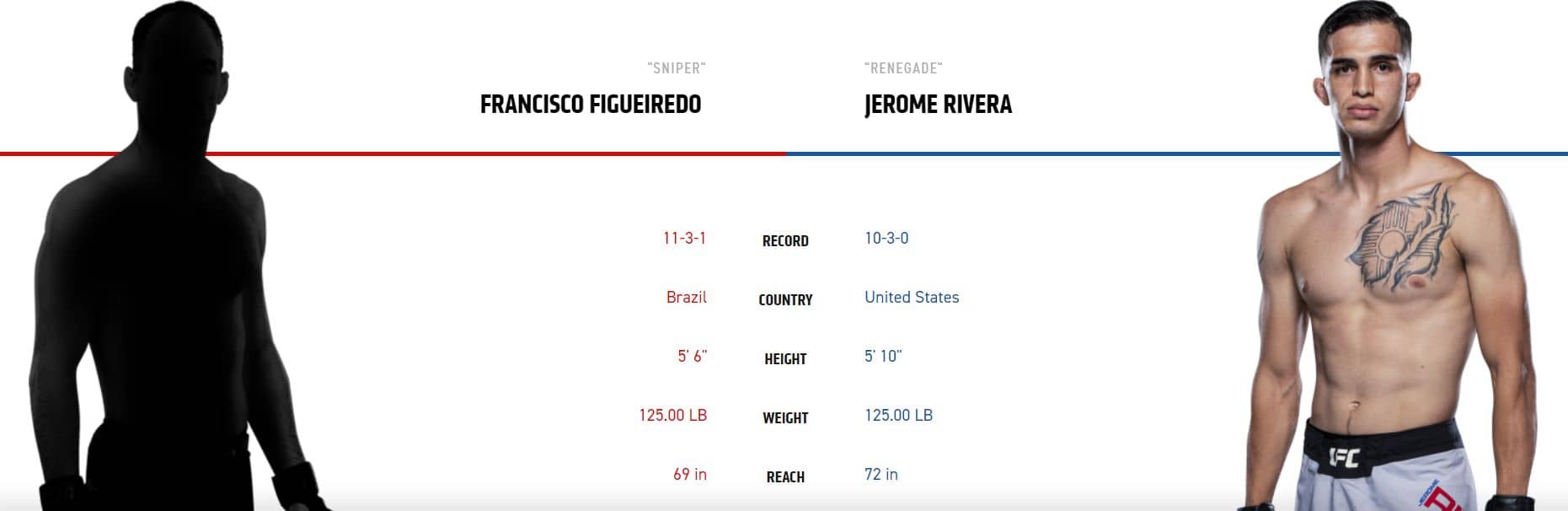 Američan Rivera si po svém nepovedeném debutu v UFC kde vyfasoval tvrdé KO musí napravit reputaci. Jedná se o velmi solidního zemaře, ale ten postoj je celkem mizerný. Brazilec Figueiredo na tom ovšem není o nic lépe, spíš naopak… Jeho obrana v postoji je napraosto tragická. Čekal jsem, že teda bude dobrý alespoň na zemi, ale musím říct, že tady bude mít výhodu Američan. Brazilcovou jedinou předností jsou jeho tvrdé údery, ale to na UFC prostě nestačí. Sázím na underdoga Riveru v kurzu 2,19.