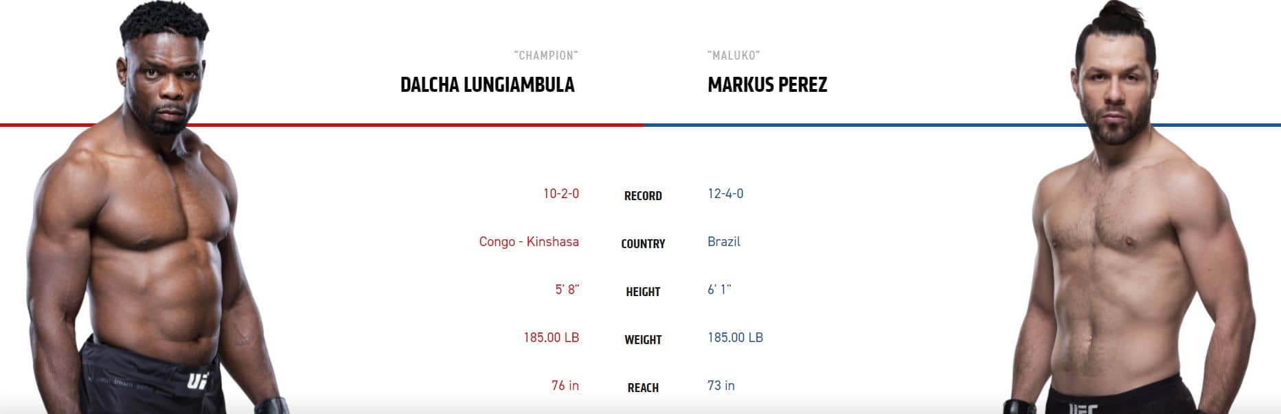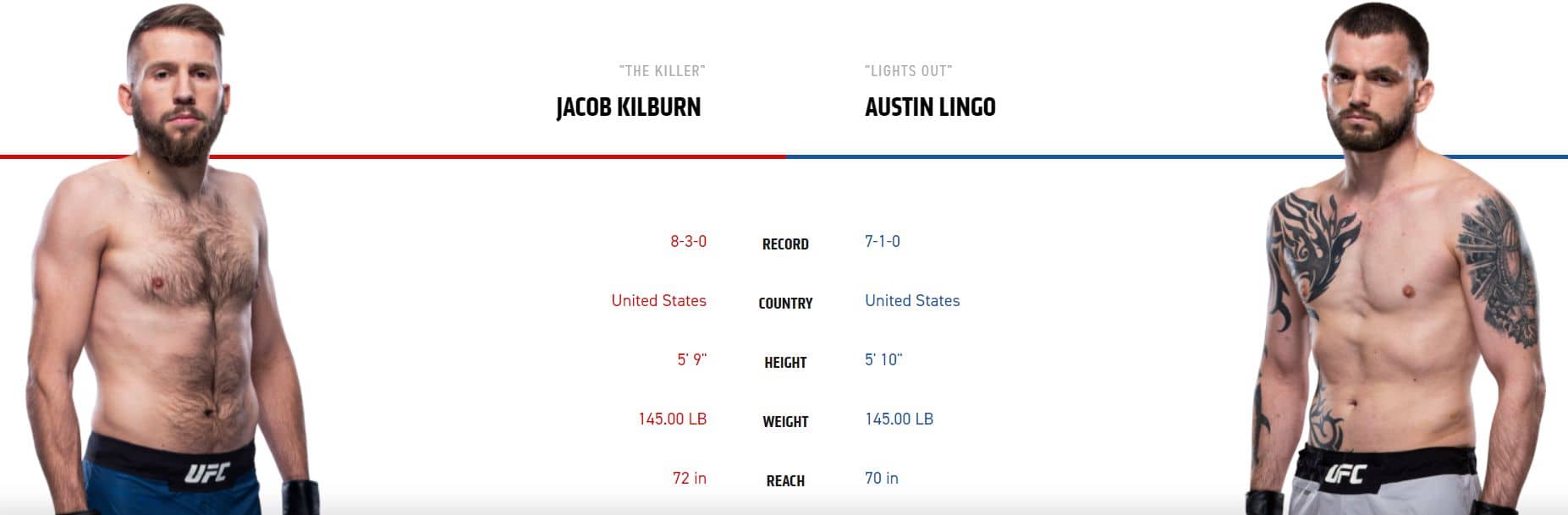 První zápas v roce 2021 obstarají Američané Jacob Kilburn a Austin Lingo. Žádná velká jména, ale říkám vám, že tihle dva si nic nedarují a může se jednat o černého koně celého eventu. Pro oba jde teprve o druhý zápas v UFC, když nezvládli svůj debut a prohráli. Rozhodně tu nečekejme žádný technický a nudný zápas, ale pořádnou přestřelku dokud’ někdo nepadne. Lingo je lehký kurzový favorit s čímž taky souhlasím. Sázkovou příležitost tady bohužel nevidím. Nicméně zápas si určitě nenechte ujít, protože tohle bude válka se vším všudy.