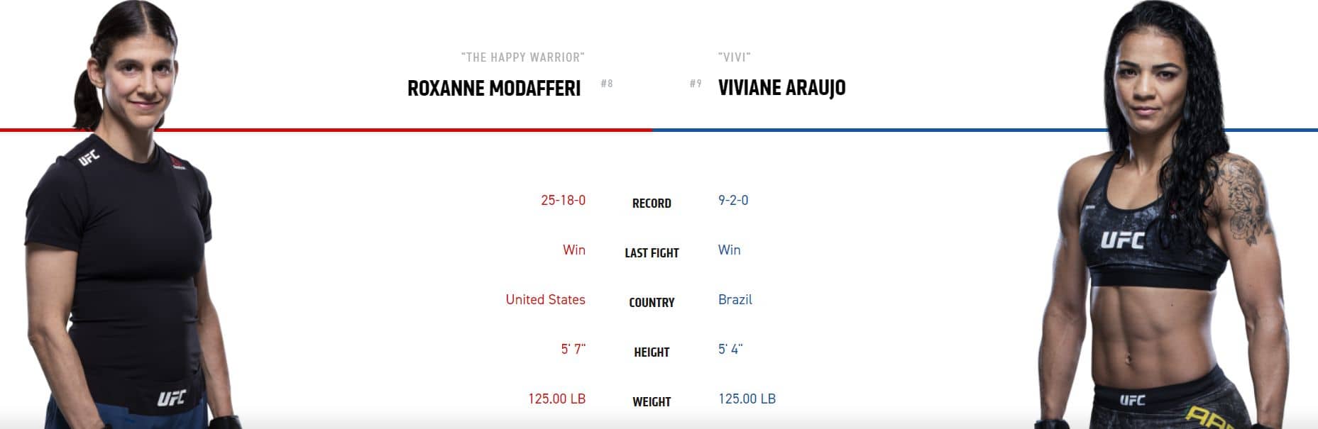 Hodně lidí sází na Američanku Modafferi, protože je vždy velký underdog a překvapivě často se jí daří vyhrávat. Americká veteránka sice není moc technicky vybavená, ale její srdce a odolnost jsou až neskutečné. V tomhle duelu to ovšem stačit nebude. Brazilka Araujo je bez debat lepší postojářka i zemařka. Modafferi bude muset jít po takedownu, ale Araujo patří v odmítání takedownů k nejlepším, a i když by se nějakým zázrakem boj na zem přesunul, tak Araujo je v BJJ prostě jinde než američanka. Brazilka by měla v zápase dominovat a vyhrát na body, ale výhodný kurz tu hledám marně.