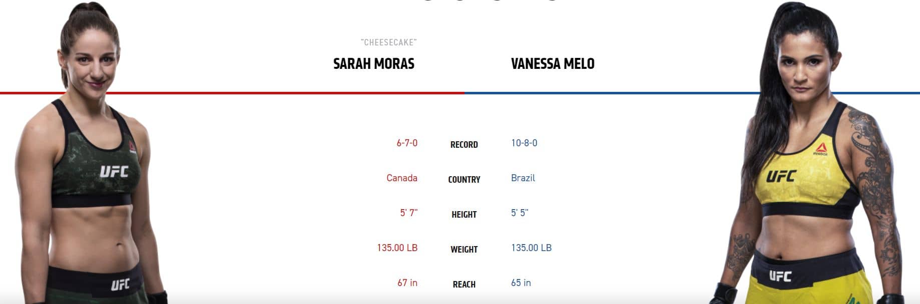 V dalším zápase se představí ženy. Sarah Moras vs Vanessa Melo. Jasnou favoritkou je podle bookmakerů kanadská bojovnice, ale s tím nemůžu souhlasit. S. Moras bude na výhru potřebovat brát Brazilku na zem, ale Melo má solidní obranu proti takedownům (70%) a podle mě se naházet nenechá. Brazilka má sice nezajímavou bilanci (10-8), ale na druhou stranu bojovala proti kvalitním soupeřkám. V postoji potom lehce favorizuji Brazilku. Ukončení určitě nečekám. Vidím to na velmi těsný zápas na body. Na ticket si dám Melo na body ve skvělém kurzu 4,00 (Tipsport).