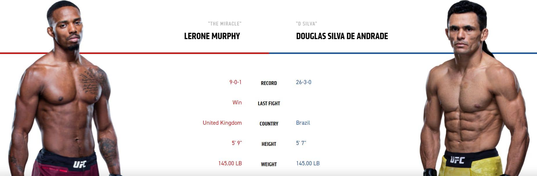 Velkou výhodu co se týče stylu by měl mít Angličan Murphy. Je to totiž o dost lepší postojář než brazilský veterán Andrade. Brazilec je sice hodně odolný a rozdává pěkné bomby, ale ta rychlost a delší dosah rukou o 13 cm prostě budou hrát pro Murphyho. Za zmínku stojí i Murphyho solidní wrestling, ale nemyslím si, že v tomto duelu se bude rozhodovat na zemi. Brazilec má úctyhodných 19 KO, ale neočekávám, že by přidal svoje dvacáté. Vsadil jsem na Murphyho na body, protože Brazilec je velmi odolný a knockoutovat ho dokázal pouze šampion Yan. Murphy se navíc vyloženě za KO nepožene a spokojí se s bodovou výhrou. Kurz 3,70 se mi opravdu líbí.