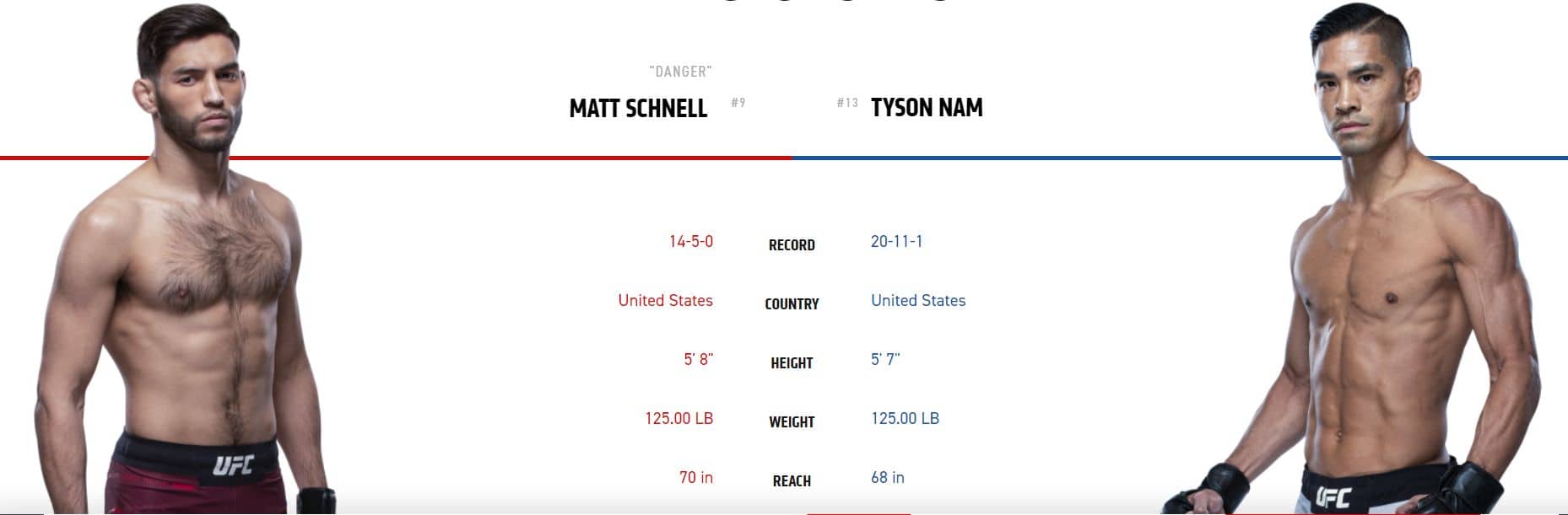 Souboj dvou Američanů se rozhodne v postoji. Schnell sice více úderů rozdá, ale Nam má neskutečné granáty. Dříve nebo později Schnell zjistí, že Namovi údery už dlouho nesnese a rozhodne se vzít boj na zem. Nam má ovšem velmi kvalitní obranu proti takedownům a byt’ Schnell je dobrý zemař, tak jeho wrestling paradoxně za moc nestojí a nemyslím si, že dostane Nama pod sebe. Řekl bych, že tady bude jenom otázkou času než Nam trefí čistý úder na hlavu soupeře. Schnellova odolnost není moc velká a to v souboji s Namem určitě nechcete. Posledně jsem trefil Namovu výhru na KO a proti Schnellovi to vidím stejně. Nam už má hodně porážek na body a poslední dobou si prostě chodí pro ukončení za každou cenu. Nama na KO za 2,35 beru všema deseti.