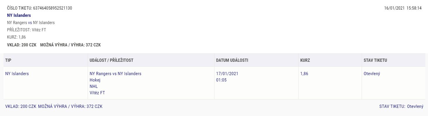 Ať se koukám na statistiky nebo sestřih z prvního zápasu, NY Rangers navázali tam, kde minulý rok skončili. Tento tým se mi (zatím) nelíbí. Má sice potenciál, ale je značně rozladěný a aby mohl pomýšlet na lepší výsledky, bude muset udělat ještě hromadu práce. Naopak Islander se jeví ve velmi dobrém světle. Minimálně Rangers by měli porážet minimálně dvakrát ve třech zápasech, tudíž výhra do rozhodnutí s kurzem nad 1,70 má pro mě hodnotu. Nejlepší kurz mají u Sazkabetu (1,84), ale za rozumnou cenu můžete vsadit i u dalších sázkovek.