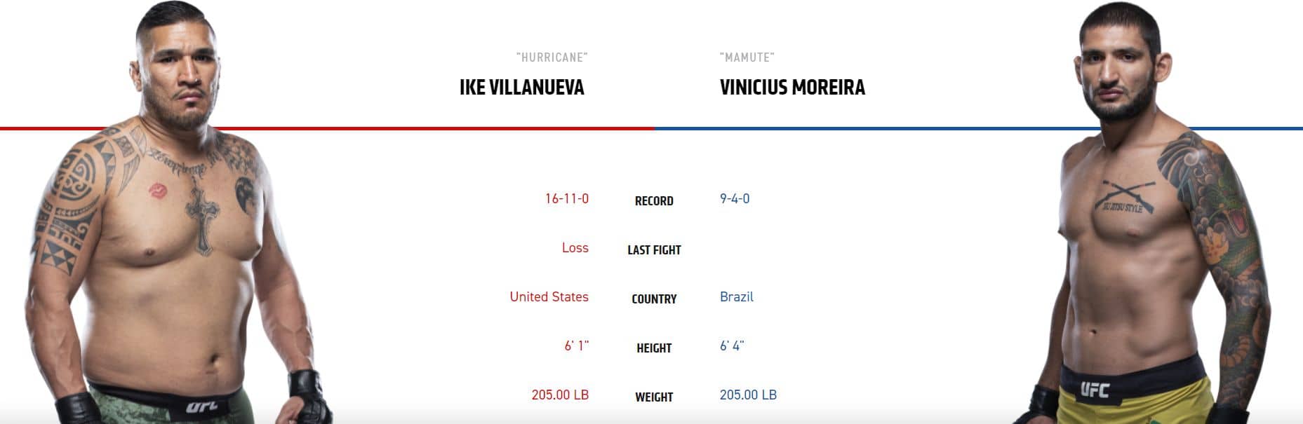 No upřímně oba tito bojovníci se neřadí mezi to lepší co může UFC nabídnout. Moreira může nabídnout překvapivě kvalitní zem a velmi dobré pokusy o submise, ale jeho velkou slabinou je skleněná brada která většinou nevydrží téměř nic. Villanueva se v UFC stal mým oblíbencem. Ne snad, že by vyhrával, ale 2× jsem trefil, že prohraje v kurzech (4,50 a 1,77). Jinak je to takový dirty boxer se solidním úderem. Villanueva už ovšem 5× prohrál na submisi a na zemi je špatný obecně. Zápas rozhodne jeho schopnost odmítat takedowny. Ta se zdá být solidní, ale Moreira dá do těch pokusů o takedown úplně vše a to mě znepokojuje. Když uspěje, tak vyhraje na submisi a jestli ne, tak prohraje na KO. Za mě je lehký favorit Villanueva, ale to nic nemění na tom, že kurzy jsou bohužel dost marné.
