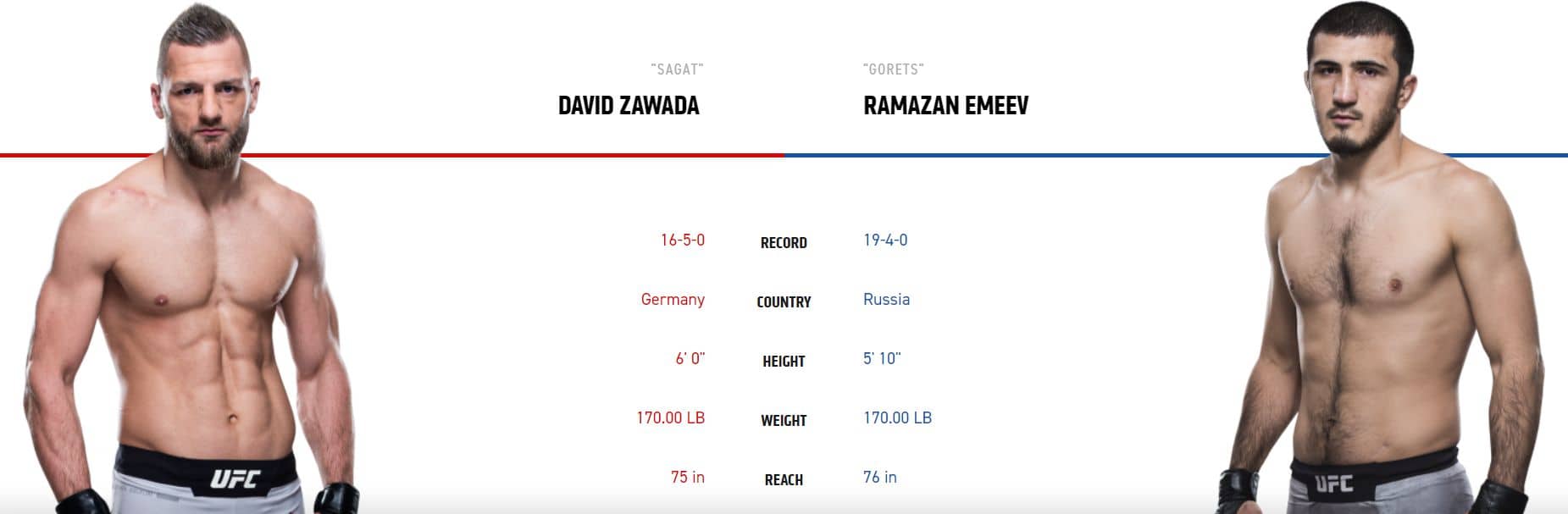 Velkým favoritem je ruský bojovník Emeev. Rus sice nerozdá tolik úderů jako Zawada, ale tady se zápas stejně bude rozhodovat na zemi kde má rus výhodu. Němec je sice nebezpečný i ze zad, ale nevěřím, že Emeeva na něco nachytá. Očekávám nepříliš záživný zápas a Rusovu výhru na body, i když v kurzu 1,90 bych to osobně neriskoval, protože ukončení z jedné či druhé strany by mě tu určitě nepřekvapilo.