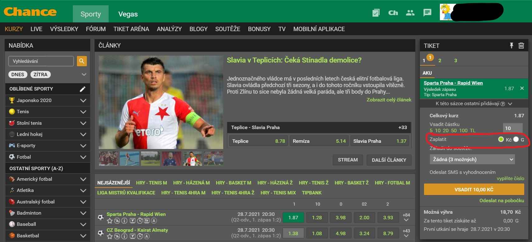 Jestliže máte Goldeny na účtu, můžete je použít k zaplacení tiketu. Je to snadné. Jakmile si vyberete sázkové příležitosti a do okénka „vsadit částku“ vepíšete požadovanou sumu ke vsazení, překlikněte způsob platby – z Kč na G (tedy Goldeny). Možnost zaplatit Goldeny najdete hned pod okénkem „Vsadit částku“ (viz obrázek). Nakonec potvrdíte tiket kliknutím na oranžové tlačítko „Vsadit xxx“.