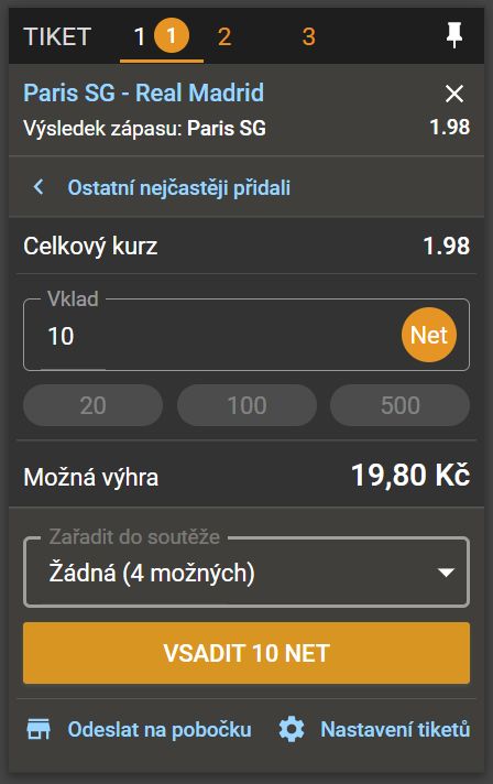 Jakmile na účet (Tipkonto) získáte nějaké Nety, je na čase je použít a zaplatit s ním svůj příští tiket. To uděláte velmi snadno. Stačí se přihlásit na svůj účet, z nabízených sázkových příležitostí vytvořit požadovaný tiket a po vložení částky pro sázku přepnout z možnosti „Kč“ na možnost „Net“ (viz obrázek). Vše nakonec potvrdíte kliknutím na tlačítko „Vsadit XXX NET“.