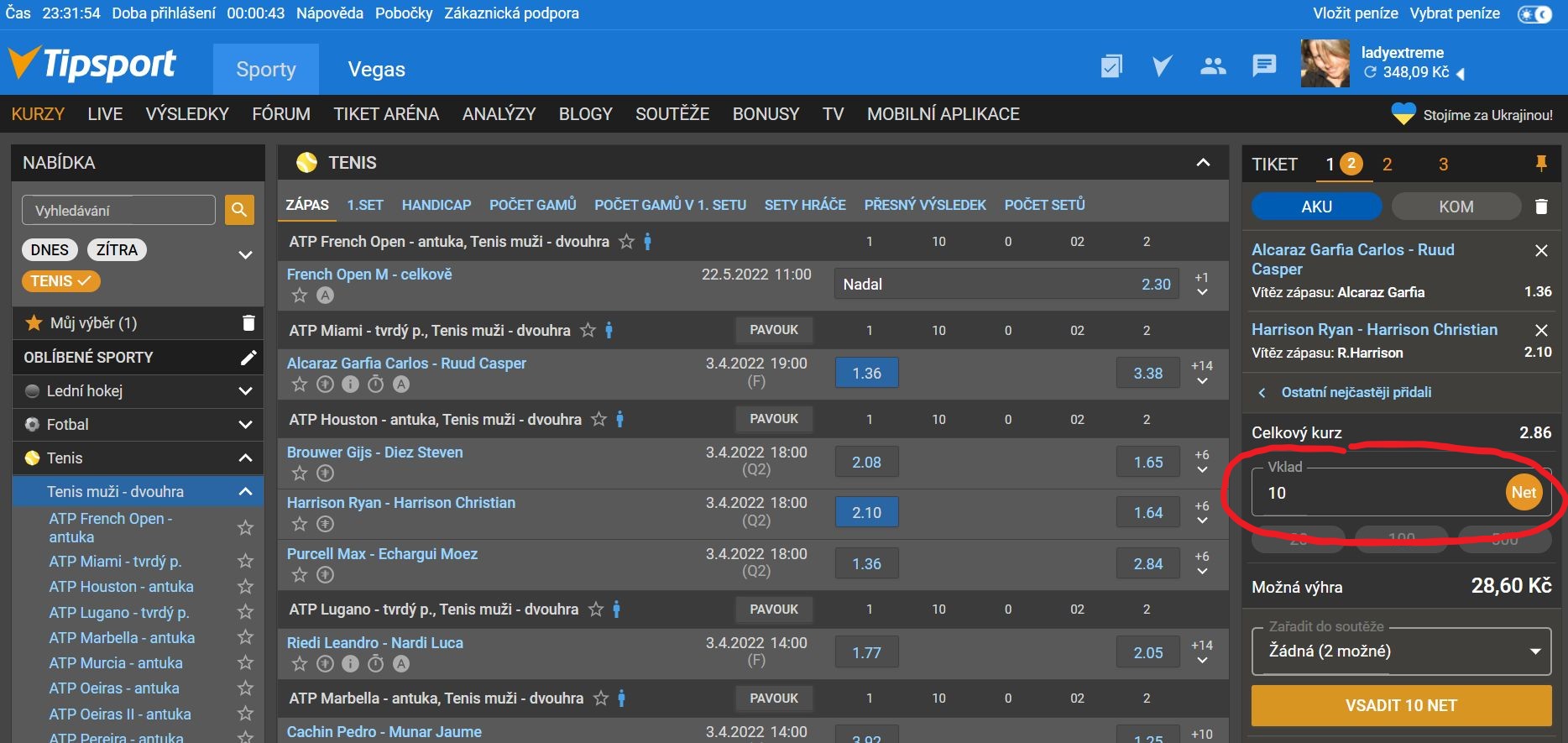 Na vybranou sázku obvykle sázíme všechny bonusové peníze. Pokud nechcete riskovat vše na jednu sázku, můžete bonusové peníze rozdělit na dvě nebo třeba čtyři různé sázky. Postup u každé sázky je dále stejný.
