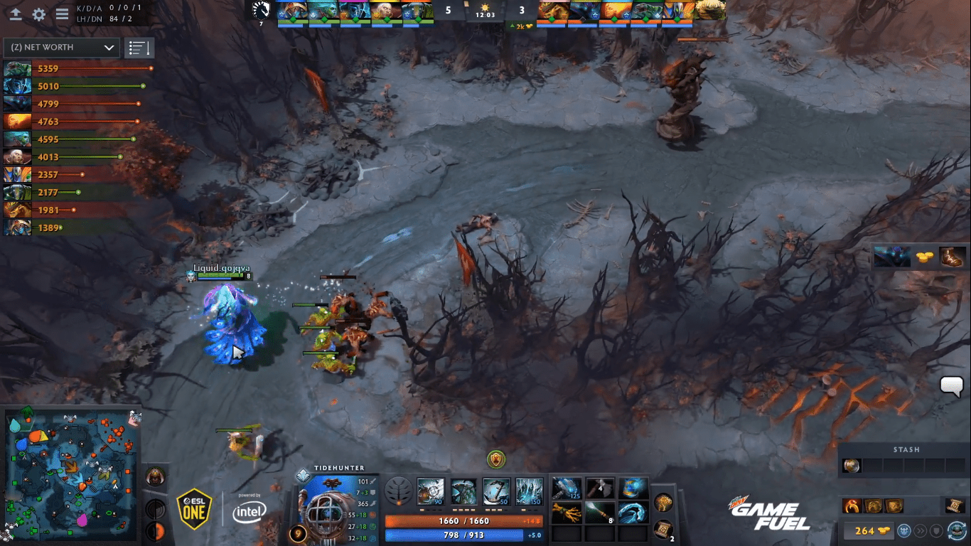 Mezi nejlepší zápasy na sázení patří hlavně unikátní hry, jako je ta na obrázku. Tým Liquid nastoupil do zápasu se svými nejlepšími hrdiny, kteří tvoří navzájem se doplňující pětici. Reakce kapitána Mudgolems ve fázi výběru hrdinů byla velmi originální. Na pozici support hraje Bristleback, což jsem za celou sezónu neviděl. Zajímavá je itemizace některých hrdinů, na obrázku má Tidehunter “Meteor Hammer”, které není na tomto hrdinovi příliš běžné.