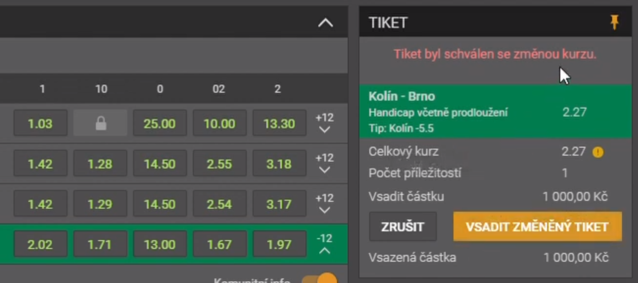 Nicméně pokud trefíte výhodný kurz, tak se vám nejspíš stane, že bookmaker vám kurz před očima sníží a nabídne vám vsadit za sníženou cenu. To můžete vidět ve videu číslo 2: