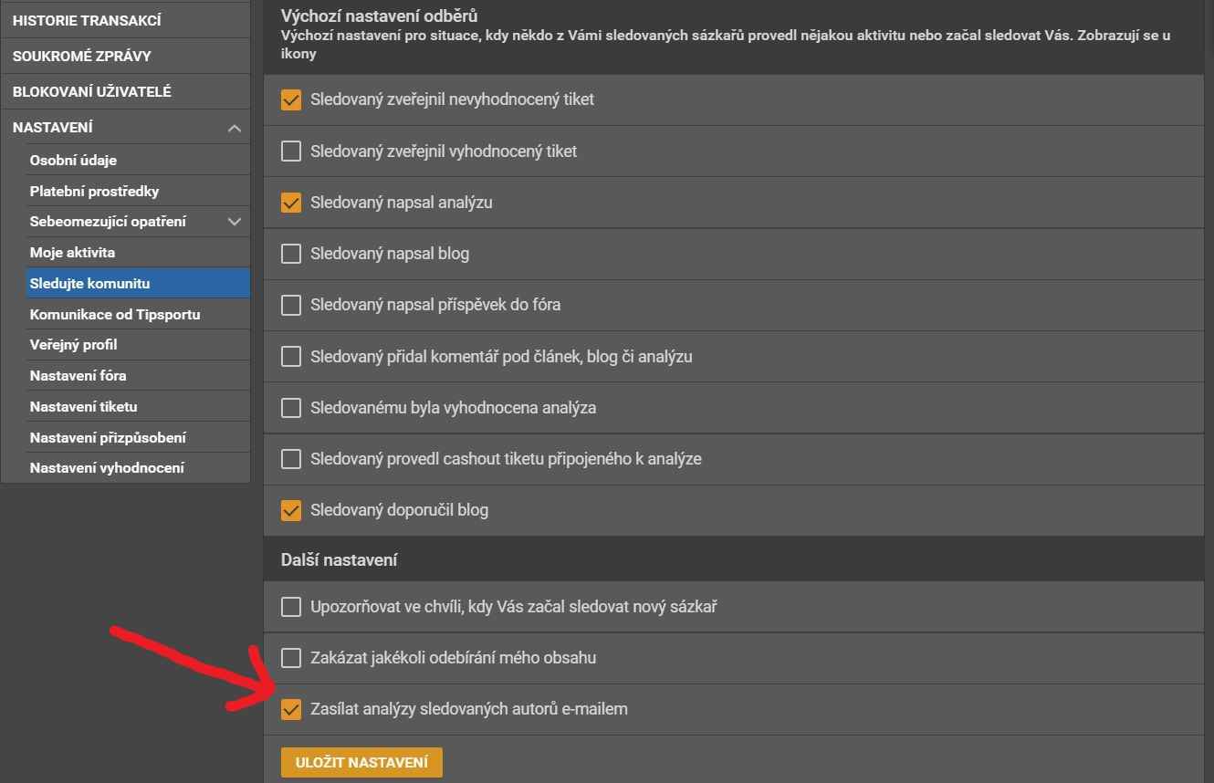 Pakliže vám nechodí emaily s tipy z Tipsportu a Chance, po přihlášení na svůj sázkařský účet přejděte do „Nastavení“ a dále pokračujte na možnost „Sledovat komunitu“, kde zaškrtněte políčko „Zasílat analýzy sledovaných autorů emailem“ (viz obrázek). Svůj výběr potvrďte kliknutím na tlačítko „Uložit nastavení“.