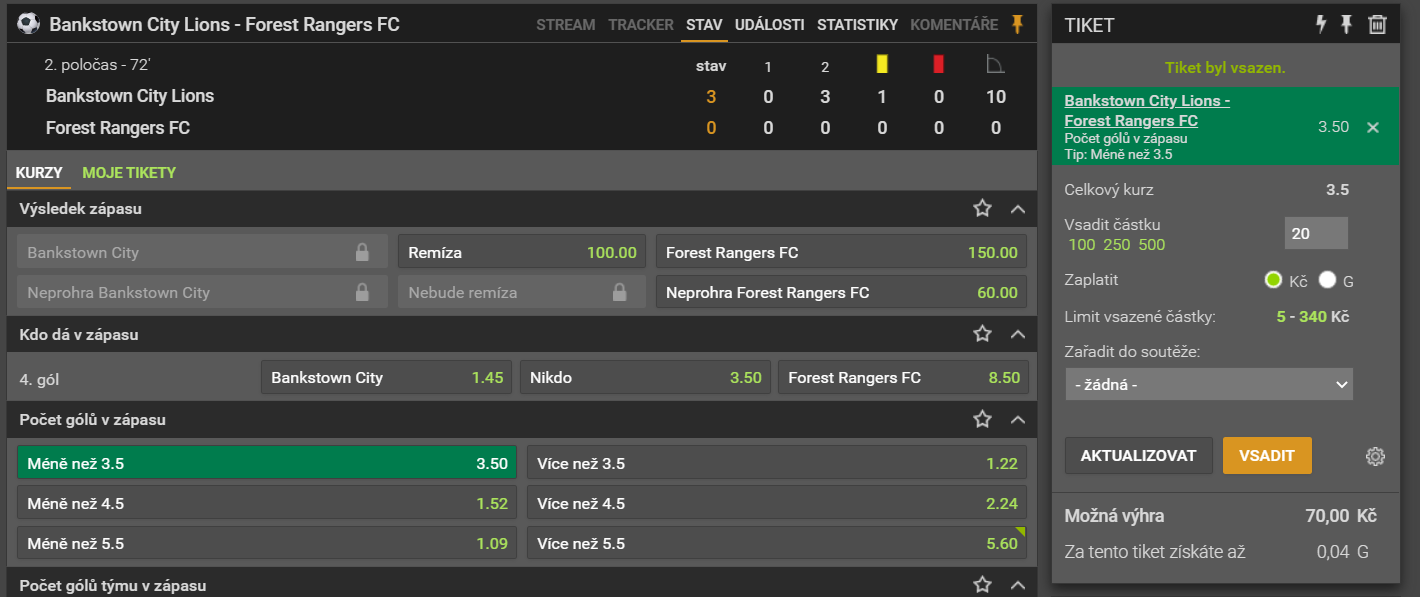 Mám rozehrané tři série. V prvním zápasu jsem vsadila 10, 30 a 70 korun. Kurz na další under je sice příznivý (2,20), ale zápas je hodně divoký a tak se sérii rozhodnu převést. V druhém zápasu jsem vsadila 10, 20 a 50 korun. V tomto zápase se hraje opatrněji a proto bookmaker na další under vypsal kurz pouze 1,30. I tuto sérii se rozhodnu převést.