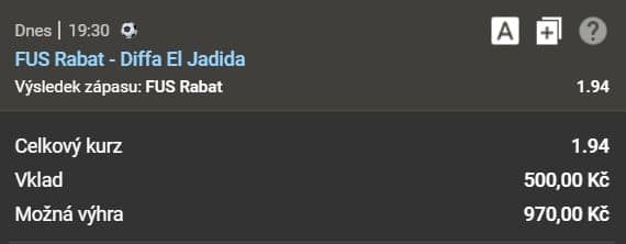 Jednoznačně doporučuji sázku na domácí. Domácí vyhráli 3 z posledních 5 vzájemných zápasů (a poslední dva vzájemné zápasy v řadě). Nejlepší kurz na FUS Rabat najdete na Sazkabet, konkrétně se jedná o tip AH-0,5 (2,04), ale pěkný kurz mají ve všech sázkovkách. Doporučuji vsadit do kurzu 1,90.