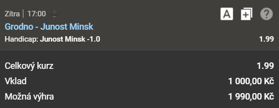 Yunost Minsk vyhrálo posledních 6 venkovních zápasů v řadě. Ve třech případech to zvládlo o 2 a více gólů. Yunost Minsk vyhrálo poslední 4 vzájemné zápasy, ve třech případech to zvládlo o 2 a více gólů. Yunost Minsk je o poznání kvalitnější tým, než Neman Grodno (a vlastně jak většina týmů běloruské ligy) a tento zápas by opět měl vyhrát větším gólovým rozdílem. Proto doporučujeme sázku na výhru hostů AH-1.