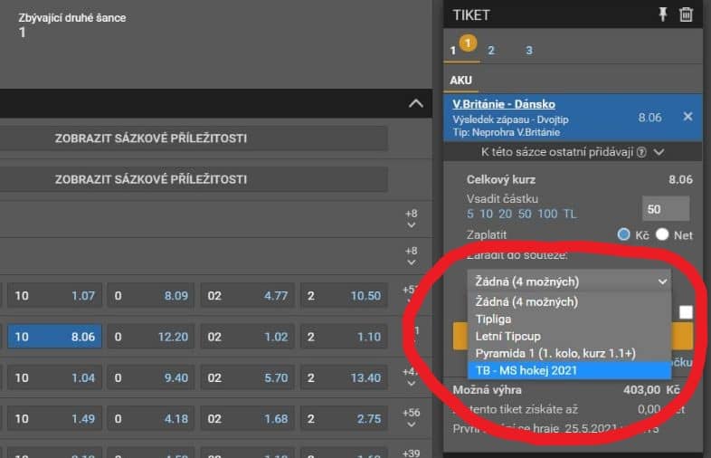 Poslední podmínkou pro účast v Tipbanku je, abyste každý z vámi vybraných tiketů do Tipbanku zařadili ručně v prostředí tvorby tiketu a to výběrem Tipbanku z rozbalovacího menu u položky „zařadit do soutěže“ (viz obrázek).