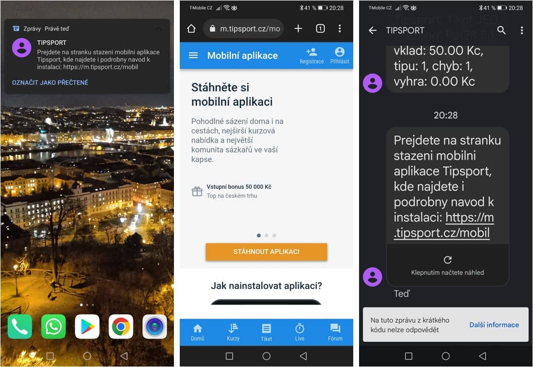 Tipsport aplikaci si můžete stáhnout ze stránek této sázkové kanceláře, ať už máte jakýkoliv mobilní operační systém. Do vyhrazeného okna stačí vložit telefonní číslo a kliknout na možnost „Odeslat“. Tipsport vám obratem pošle odkaz na stažení aplikace společně s návodem.