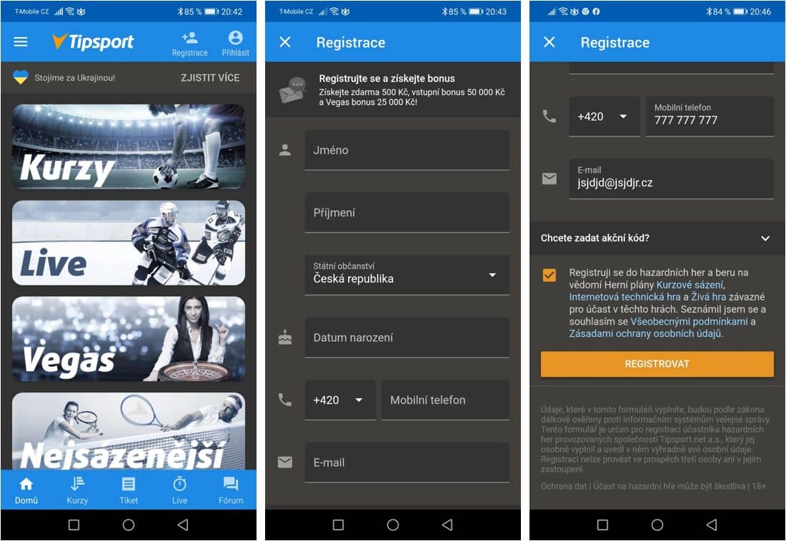 Dokončení registrace v Tipsport aplikaci, stejně jako dokončení registrace v desktopové verzi stránek, sestává ze tří kroků: