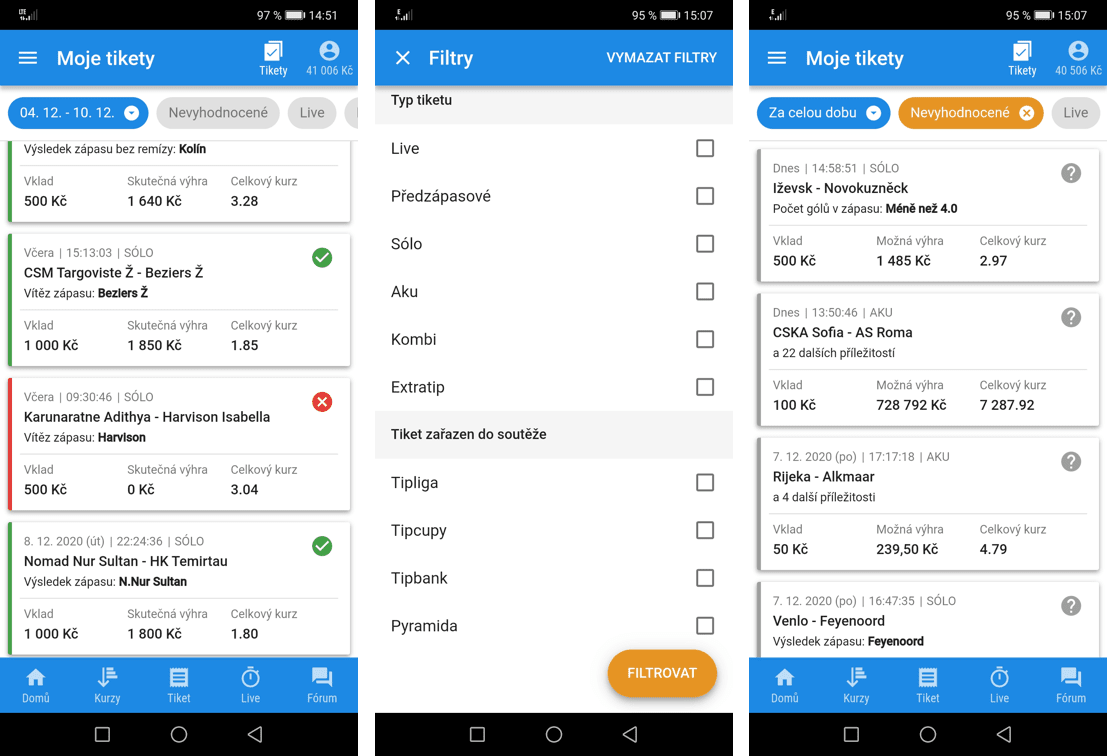 Po přihlášení se dostanete do svého sázkařského účtu, kde si můžete zkontrolovat všechny podané tikety, ať už jsou vyhodnocené nebo na vyhodnocení teprve čekají. Stačí ťápnout na možnost „Tikety“ v pravém horním rohu. V menu tiketů je k dispozici několik nástrojů pro třídění tiketů. Tikety můžete třídit podle data, podle způsobu sázky (pre-match nebo live), podle zařazení do soutěže nebo podle druhu sázky (Sólo, Aku, Kombi či Extratip). Díky tomu vám neuteče žádný vsazený tiket!