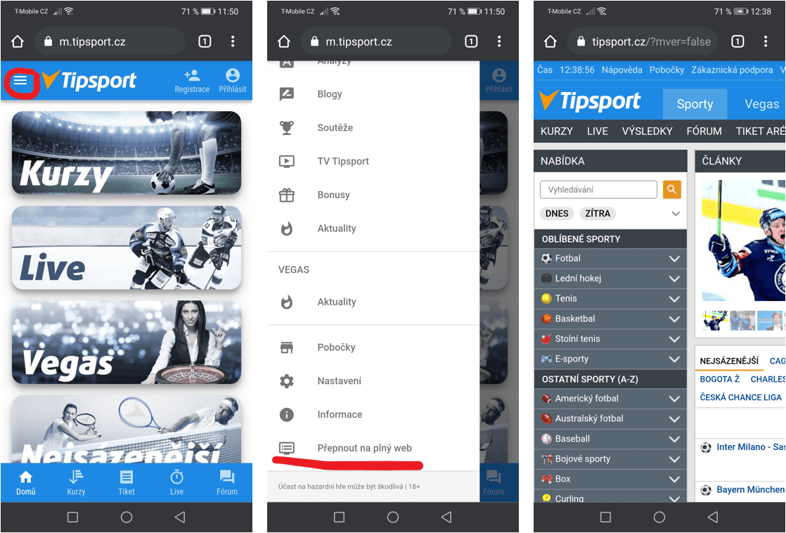 Tipsport kontrola tiketu je v základní podobě dostupná pouze na počítačích (viz návod výše). Pokud svůj tiket chcete zkontrolovat skrze mobilní zařízení, musíte na stránkách Tipsportu přepnout z mobilní verze zobrazování stránek na klasické zobrazení. Možnost přepnutí najdete po otevření menu (ikonka se třemi čárkami v pravém horním rohu) a následně na kliknutí na možnost “Přepnout na plný web” nacházející se v nabídce úplně na konci.