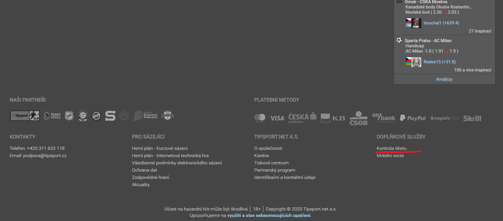 Kontrola tiketu u Tipsportu je velmi snadná. Otevřete si aplikaci Tipsport kontrola tiketu na stránkách sázkové kanceláře buď přímo přes sdílený odkaz, nebo kliknutím na možnost „Kontrola tiketu“ na pravé straně patičky webových stránek Tipsportu (viz obrázek).