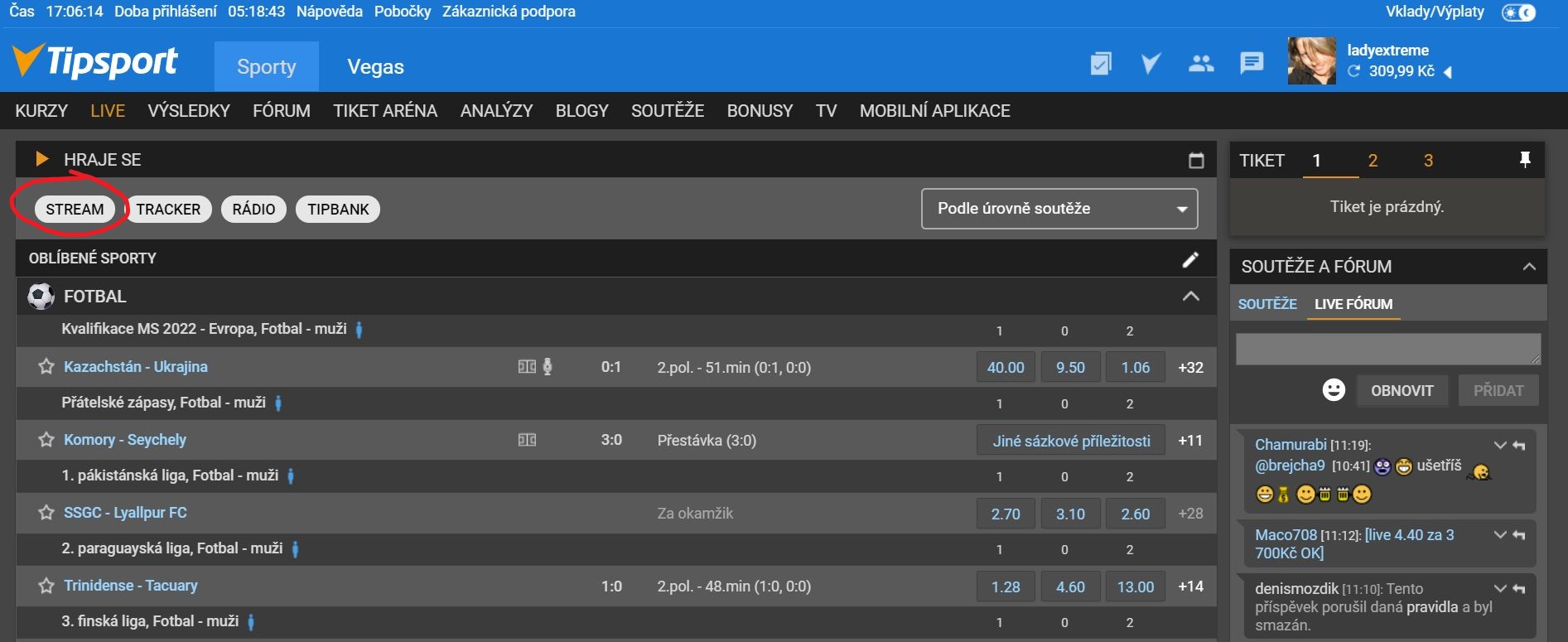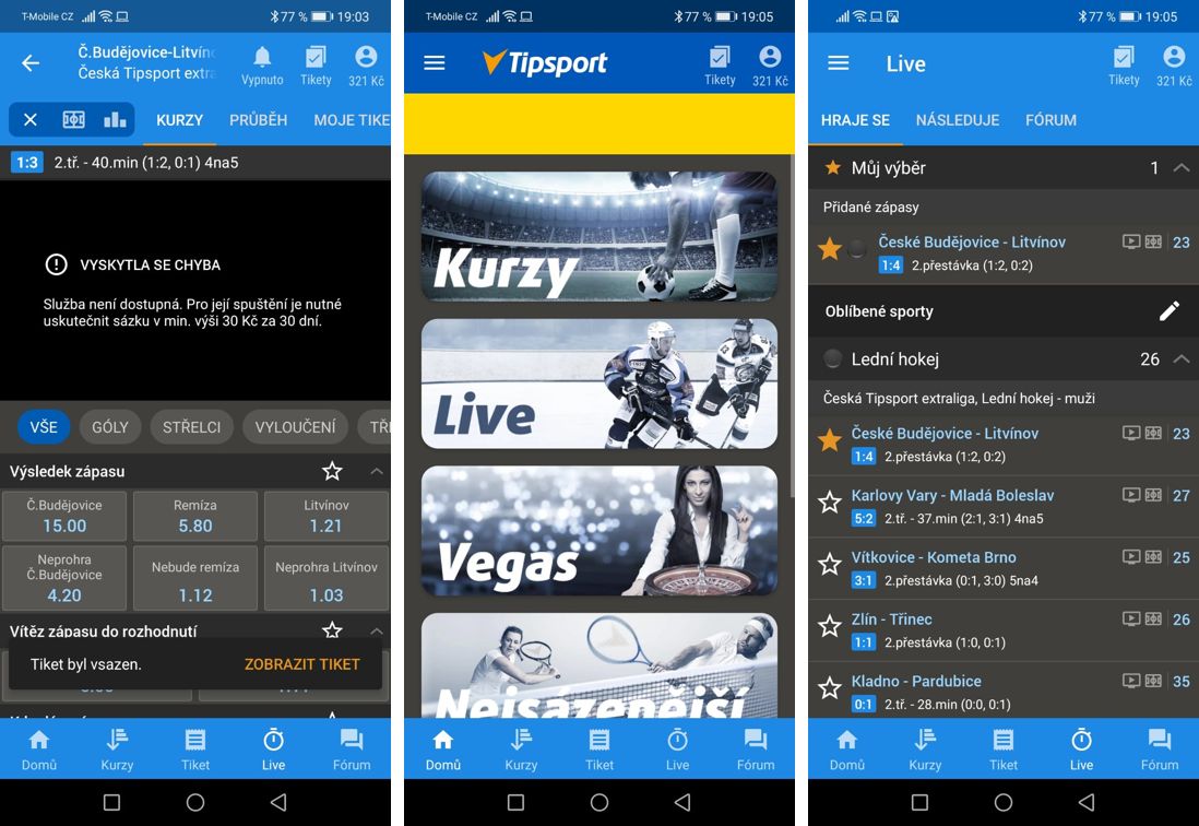 Tip: Pakliže se live přenos nerozjede, můžete vyzkoušet aktualizaci stránky potažením celého okna aplikace směrem dolů. Další možností je, že jste si v posledních 30 dnech ještě nevsadili v součtu za 30 korun, což můžete změnit prostřednictvím vypsaných kurzů pod vybraným streamem.