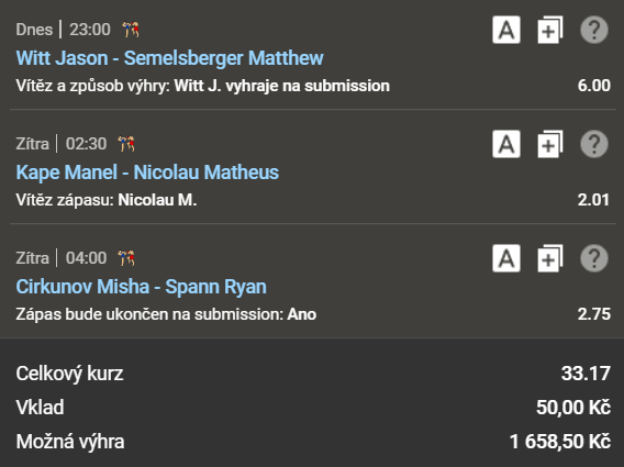 Američan Spann v posledních dvou zápasech nevypadal vůbec dobře. Nejprve vydřená výhra na SD proti veteránovi Alvymu a potom tvrdé KO od Walkera. Lotyš Cirkunov se naposledy představil koncem roku 2019, když jako první přemohl Cruta. Cirkunov půjde ihned po takedownu a Spannova obrana proti nim není kdovíjaká. Čekám, že dostane Spanna pod sebe a tam by ho měl i rychle ukončit na submisi jak to udělal i ve svých posledních pěti výhrách. Jedinou šancí Spanna bude trefit Lotyše v postoji. Cirkunov sice nemá moc odolnou bradu, ale Spann taky není žádný bombarďák a jestli Lotyše opravdu nějak tvrdě trefí, tak by zápas mohl pokračovat s tím, že Lotyš bude nahulený a Spann se dostane do výhodné pozice a naopak on utáhne Cirkunova. Obecně ovšem více věřím Lotyšovi a po váze kde vypadal Spann nejhůře jak jsem ho kdy viděl jsem se rozhodl i vsadit. Tady ovšem zvolím jistější formu sázky a to, že zápas bude ukončen na submisi v kurzu 2,80. Na body to nedojde a submise se mi zdá mnohem reálnější než KO.
